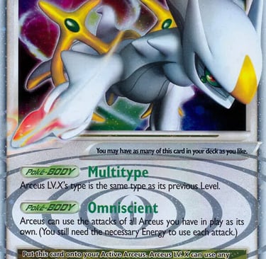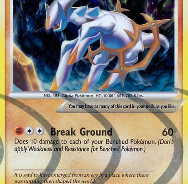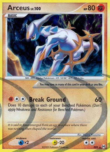 The fighting Arceus is also one of the better ones since Break Ground hits for that key 60 damage without any energy discards, meaning it’s the best attack to use when hitting SP Lv.X pokemon for weakness. Being fighting type means it can OHKO Luxray on its own too even without Omniscient Arceus. Hitting all of your other cousins for 10 sucks but it’s much better than discarding multiple energies.