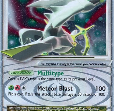 If you’re at least somewhat familiar with this deck you may be surprised to see this Arceus Lv. X included as it is considered the worst of the 3 prints. However, I truly think that’s debatable. It is surely less useful than the former one we just looked at as it isn’t as versatile but compared to the one with Psychic Bolt it can be argued if it’s really outclassed. They both can do 100 for 3 using a different combination of energies and have also different costs for this damage. The Psychic Bolt one guarantees that damage with the cost of discarding a psychic and a lightning energy. On the other hand this one right here requires you to flip a coin. You get heads, you do 100 for no cost; tails you do 50 damage instead. It’s clearly obvious why this one would be deemed the worst by most players and for the longest time I thought the same. It won’t be consistent and reliable so why use it if you have a similar and more reliable option? 2 reasons. First, Meteor Blast uses a more practical combination of energies.