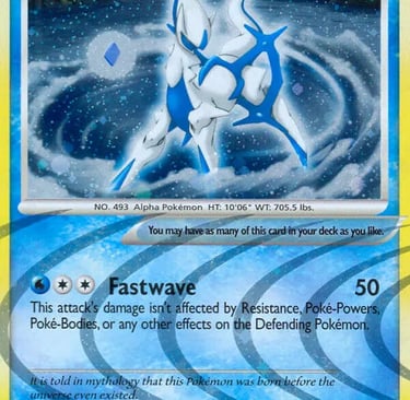 In my head this is the best regular Arceus in terms of attacking and packs 90 HP instead of 80 or 70. Simply because Fastwave ignores any annoyance your opponent may be packing and does a solid 50. If it did 60 then this would have been the best attack to use against SP all the time, hitting them for weakness and getting OHKOs. At 50 though Lv. X pokemon will survive even with a x2 weakness. Regular evolution pokemon with a +30 weakness will usually need two shots to kill them off but nevertheless this is the safest attack to use as it doesn’t have any bad conditions, specifically discarding energies. You can hit Mewtwo Lv. X with it, which would otherwise wall this deck and as a water type, this card always kills Blaziken FB Lv. X if it used Jet Shoot the previous turn.