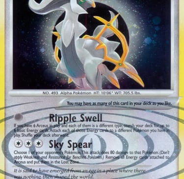 Between those 6 energies and the manual attachments you get every turn (you don’t want to miss) you’ll have to get by. The deck won’t able to do much if you can’t pull this attack off. With all the different types of Arceus included and needed anyway for Ripple Swell to work, the deck should tag between the different types of Arceus that give you the advantage depending on your opponent’s pokemon. Sky Spear is a very good attack, being a snipe for 80 but the cost is a pretty hard one to stomach. All energies attached to this Arceus go into the Lost Zone. This sucks even more because it means we can’t get them back with Night Maintenance or a different card. While useful, you’ll need to be very careful with how you use this attack. Even if it’s tempting, I’d actually discourage from using it unless you’re late in the game and plan to win a with few more attacks. And you better make sure you always get a KO with it. If you don’t use this attack correctly you will seriously lose to yourself by running out of energies or not having enough to attack, missing turns attacking and then losing even more when your opponent gets a KO.