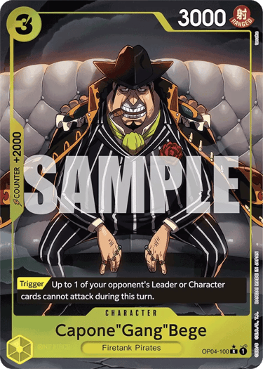 Bege from OP04 is one of the first OG broken yellow trigger cards that any yellow deck can include. Run it as a nice +2000 counter in hand and if it ends up in your life, then even better. His trigger effect will prevent an opponent's character and even leader from attacking no matter how strong. Another trigger card that could seal your opponent's loss if they step on it at the wrong time. Unfortunately, while I'd love to max it out, we also have to account for enough cards to fall into the Straw Hat and Egghead theme for our searchers to work. For this reason I only run 2 copies and substitude the other 2 for another similar card.