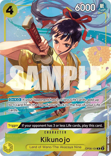 This card can be extremely good in any yellow deck but can also miss the mark. That's because your opponent could possibly play around her main effect and her trigger effect has a condition that you could fail to meet if triggered at the wrong time. She also can't defend you if she's in your hand meaning you're almost forced to summon her if you want her to do anything. 4 cost for 6000 attack power is as good as it can get so it's understandable why she doesn't have a +1000 counter in hand. Her trigger effect will allow you to summon this solid attacker for free as long your opponent is at 3 life or less. Her main effect will also grant you a free life card from the top of your deck if she's KOed. Again, as long as your opponent is at 3 life or less. Now against OP13 Ace and a few other leaders all of her merits are active automatically but against other decks you're going to have to put in some work to meet those conditions.