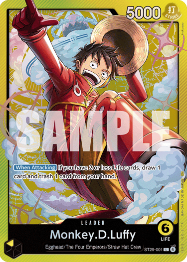 The new Luffy leader from starter deck 29 is a pure Yellow leader and part of the Egghead theme of cards. His one and only effect doesn't really give him much of a real benefit. You need to be low in life to be able to use it in the first place and it only allows you to draw and discard 1 card from your hand when this leader is attacking. The discard isn't optional, so essentially he only allows you to regulate and fix up your hand without actually drawing for extra cards. I do find that somewhat disapponting personally, but I'd still say he's a solid leader since he gets to start with 6 life cards and no negative drawback for that. With Yellow being the color specializing in having the most and best triggers, this is where this leader gets his chance to shine. In this article I'll be going through all the best trigger cards you should be running in this deck to get the most out of your trigger luck: