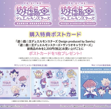 If you spend at least ¥2200/$14.67 USD on products at either Sanrio’s store or the Kaiba Corporation Store, you will also receive a random postcard based on where you shopped.
