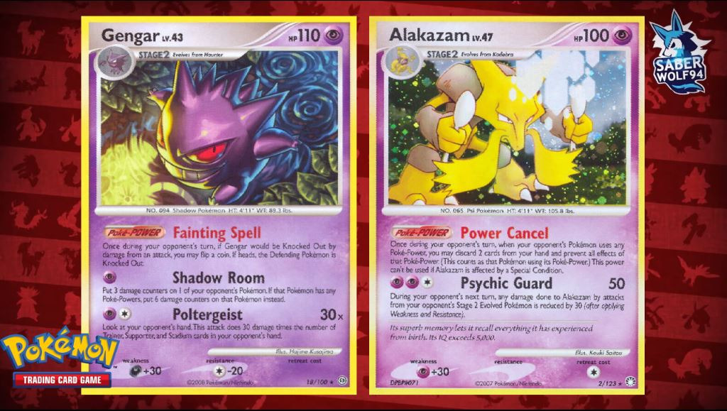 Once SP pokemon received all of their best cards by Supreme Victors the format pretty much revolved round them and the only few other non SP decks that could counter them. SP pokemon were really so fast and so consistent that seriously every other non SP deck that was strong during that time had some aspect or some gimmick that was about countering them. Whether it was speed and low energy costs with Kingdra and Gyarados, Machamp’s auto KO with Take Out, or trainer lock with Gengar to slow them down. Stormfront Gengar was an extremely strong card from when it first came out but by the end of the era, the Arceus set gave it even more excellent partners to work with along with its own Lv. X card. Gengar decks are some of the most famous and iconic from the entire DP era even going forward to the HGSS era too. They were strong, so that fame and iconicity comes naturally but they were also easy to build with some pretty basic deck skeletons. And yet even with that, Gengar decks could also take so many different forms with all the partners you could use it with. Today we’re gonna be looking at one of my versions partnered up with Alakazam, Gengar’s video game rival with a lot of similarities. Here’s the deck list: