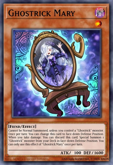 A potential win condition we have with this deck is Majesty's Fiend. If you get the monster down and your opponent can't out it with a spell or trap, they could just auto lose the game right there. He also doesn't interfere with our own cards much besides if you wanted to use Call of the Huanted on a Ghostrick xyz and then tribute Majesty's Fiend. In the situation you lose the free Sangan effect which does suck. The Ghostrick monster engine consists of 4 monster played in threes. Eat direct damage and Mary gets you Jiangshi. Jiangshi is the searcher with great defence as well that will get you everyone else including Mary. As luck would have it Specter has 0 defence and so does Jester Confit. This enables us to also take advantage of Recuring Nightmare for a good +1 recovery.