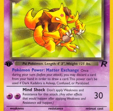 A lot of these dumb people including my parents thought that Pokemon and especially Yugioh to be satanic so even a ridiculous article with Dark Kadabra could be bad press on this guy as many dumb people would believe it. Either that or he just wanted to win some money from Pokemon. When it comes to the card itself, it’s nothing special minus the Matter Exchange poke-power allowing you to discard a card to draw a new one from your deck.