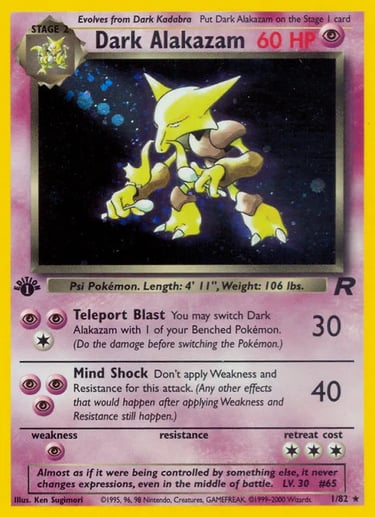 Dark Alakazam is what the cursed Dark Kadabra will evolve to and it is one of the most painful cards to look at being a stage 2 with a mini 60 HP. For sure it’s one of the best looking holographic Alakazam cards but I swear to God this is the weakest Alakazam card no question. With that incredibly low 60 HP it’s still carrying 3 retreat for some reason, both attacks cost 3 energy, so it will never be able to pull even one attack off. Especially with that HP and both attacks are weak anyway. Its Mind Shock attack is outclassed by Dewgong and any other pokemon that can do 50 for 3; the slight edge it would get from ignoring resistance is completely lost as it can’t hit for weakness either and Teleport Blast while being unique as one of the few attacks that would hit and switch is also weak and very slow even if you did want to try and make a deck around it. Besides the energy removals Gust of Wind would also ruin this card completely.