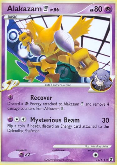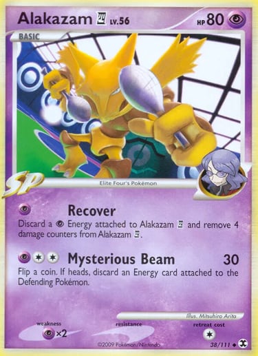 Fortune shined on Alakazam even more in DP as this was the era of SP pokemon. Not quite owner’s pokemon, but similar, since they were all basic pokemon it meant Alakazam could get a print again under the right circumstances. And indeed, since Rising Rivals was the SP set themed around Gym Leaders and the Elite 4, Alakazam was lucky enough to get featured being one of Lucian’s pokemon AND even getting the added bonus of a Lv. X card! I say “lucky” but even though Alakazam bypassed its stage 1 curse and got 2 cards in here both of them left a lot to be desired. To be straight with you, the regular SP form is just terrible. Both of its attacks are underwhelming for that time and Recover isn’t even Energy Gain compatible. Its stats are alright I guess, but it just wasn’t gonna fly compared to other SPs.
