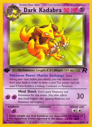 You see, the Abra line is 100% the most unfortunate and cheated in the entire tcg due to the lawsuit with Uri Geller. In the original Japanese names of the line Game Freak gave them names based on famous magicians at the time, in the case of Kadabra its name in Japanese is straight up Uri Geller and the big issue came when he realized the existence of Dark Kadabra.