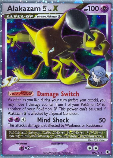 100 HP on Alakazam Lv. X isn’t anything special and only made worse with a 2 retreat cost. Worst thing on this card though is definitely the attack; doing a pitiful 50 for 3 is pathetic, even with Energy Gain this is a very weak attack. They even made it unable to hit for weakness, like dude, why are you making this card so useless?