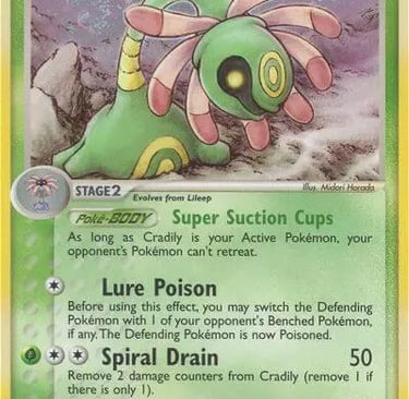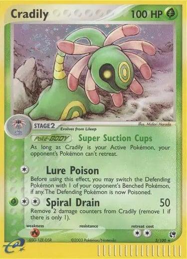 As with Lileep, the first Cradily card debuted in ex Sandstorm. Miraculously and unexpectedly, Jason Klaczynski does have an entire deck based on this pokemon having said that it still won’t be easy to use. Cradily’s stats are only average for a stage 2 with 100 HP and a double retreat but I’m sure the real difficulty in using this card isn’t the stats but getting it out efficiently as a fossil pokemon. With Lure Poison this Cradily can pull a benched pokemon and poison it while its poke-body prevents pokemon from retreating. Paired with a Houndoom in the era you can make a powerful lock deck slowly killing off your opponent’s pokemon while they’re struggling to switch. Spiral Drain is pretty solid for the time too, doing a typical 50 for 3 but also healing up to 20 damage from Cradily. This card was also featured as the main pokemon in the Caravan theme deck for ex Sandstorm.