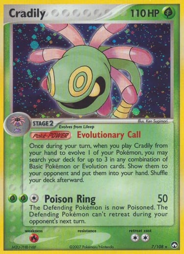 ex Power Keepers Cradily is the last print from the ex era and the most universally useful. The poke-power Evolutionary Call allows you to grab any 3 pokemon from your deck to your hand when this card evolves. This effect isn’t limited to non ex pokemon either. It also has 10 more HP than the other ones and the best attack in terms of raw damage and effects. Poison Ring also does 50 for 3 with auto poison but it also won’t let your opponent’s pokemon retreat next turn. Sceptile ex had almost the exact same attack for 10 less damage so I think this is good enough on a non ex Cradily. I don’t remember all the deck lists by heart but I think I do remember seeing this card used in at least one of Jason’s decks if not more, so despite being held back as a fossil the poke-power here is strong enough to warrant some use.