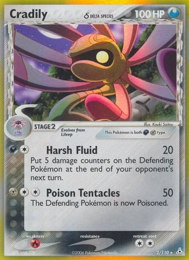 From here the other two Cradily cards released pretty rapid fire. Cradily from ex Holon Phantoms is the only other special print Cradily ever got being a delta species pokemon. Despite that, it’s actually the simplest one to utilize, as a dual dark and metal type pokemon it can use both special darkness and special metal energies to boost damage and defence. Harsh Fluid can be played around easily but if your opponent doesn’t switch the damage is incredibly strong for the time adding up to 70 without factoring special darkness energy. Poison Tentacles is also a simple but good enough attack dealing 50 with poison before any other boosts. Had this Cradily had 120 HP it could have made for a decent little tank, simple but usable since like I’ve said it is one of very few pokemon that could use both special metal and darkness energies.