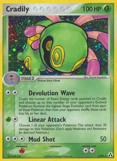 After Cradily ex it took 2 years for the next Cradily print to come out in ex Legend Maker. Its stats are exactly identical as the Sandstorm print but plays completely differently. The theme of ex Legend Maker was React Energy, a colorless special energy with no effect but something a lot of pokemon in that set needed to be at their best. Devolution Wave can be pretty nasty, devolving a number of your opponent’s pokemon for each react energy on cradily. What’s more, the cards gets shuffled back in the deck instead of going to the hand, potentially turning this into a really deadly attack. The best use would obviously to use on somewhat damaged pokemon so when they lose the extra HP from their evolved forms they’ll get knocked out. Linear Attack aids in that a little bit working as a 2 for 30 snipe in the era which was alright at the time.