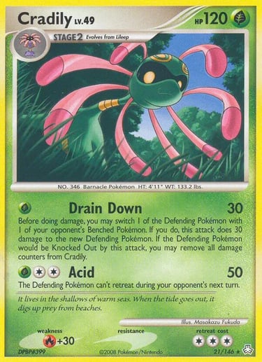 In terms of prints Cradily did very well getting 5 cards in its debuting era. However, to say that Cradily prints dried up from there would be an understatement. After Power Keepers in 2007 Cradily would only see 3 more cards up to now in 2024. Insane. The first one is in the Diamond and Pearl era in Legends Awakened. 120 HP was only okay during that time with the HP and damage standards going up in the era. Not only that, but it got an even bigger retreat compared to the ex era cards and no improvement on its 3 energy attack Acid. It does 50 for 3 and preventing your opponent from retreating. This is barely even average since every other Cradily card in the ex era hit for 50 for 3 and had better effects on top of that even. Add in all of these factors together and objectively speaking this Cradily was more of a downgrade in this era.