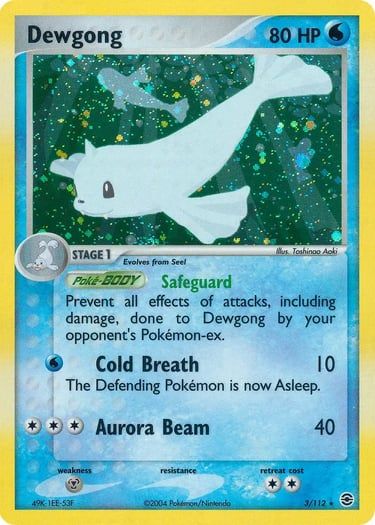 Even in 3rd gen Dewgong’s stats in Firered and Leafgreen didn’t improve from the previous ones but it gets a strong poke-body in Safeguard, making it immune to ex pokemon. Instant sleep with 10 for 1 energy is okay, and while Aurora Beam isn’t that good doing 40 for 3 at least it works with any energy, effectively making this card a flexible tech ex counter if you choose to run it. Nice holographic art and certainly more useful than the other ones that came after Base Set.
