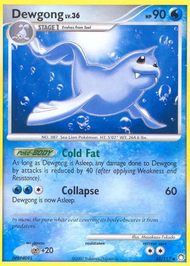 With D/P Mysterious Treasures it finally gets an improvement with 90 HP and a poke-body meant to work with its attack. Collapse does 60 for 3 which isn’t all that bad but not good either. The attack puts you to sleep too. With Cold Fat as long as Dewgong is asleep it will receive 40 less damage from anything, an impressive tanking effect. This card honestly didn’t do anything though trying this luck stuff but the art is a redeeming aspect again.