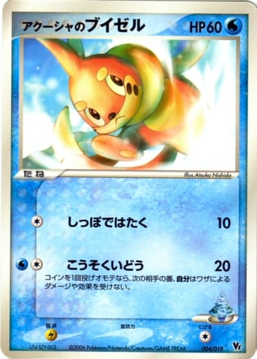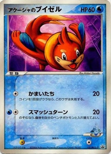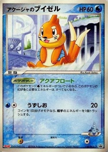 For Buizel, it has 3 Japanese exclusive promos all 3 known as Samiya’s Buizel. The first one comes as a Meiji Chocolate promo and is the only Buizel to have a poke-body. No other Buizel ever had a power or ability. The effect isn’t anything too unique, it just grants Buizel free retreat if it has a water energy on. The second promo is from the Movie Commemoration VS Pack, Sea’s Manaphy and the last one is from a Shogakukan Elementary School magazine. The only English promo we have is from the wonderful DP Value Packs more commonly just referred to as blister packs. It’s basically a holo alternate art version of the original Buizel from the first Diamond and Pearl set. I suppose Buizel from Mysterious Treasures is also somewhat unique being one of the few pokemon to have a berry effect, in this case the Chesto Berry will always ensure that Buizel wakes up at the end of the turn if it is asleep.