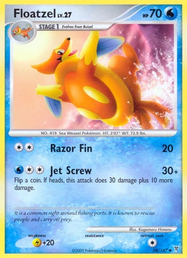 Hello everyone and welcome to another Pokemon TCG Overview. Deputing in the DP era Floatzel stood out as a water pokemon in terms of its very high speed, matching Starmie. Its solid attack complimented the high speed almost turning it into a physical attacking version of Starmie but not quite, as it didn’t share too many powerful coverage moves at least to make use of its attack stat. Besides that, I don’t really have much to add; my feelings for the Floatzel line are somewhat similar with the Hariyama line I already covered. I think they’re nice additions in the pokemon world but I’d never say they’re some of my favourite water pokemon. More importantly and rather sadly, the Floatzel line is another line that is mostly underwhelming in the tcg. Normally I’d say it’s not as bad as the Furret line or Skarmory, pokemon that are even older but after examining all its cards it might just be the most underwhelming pokemon line I reviewed in this series so far.
