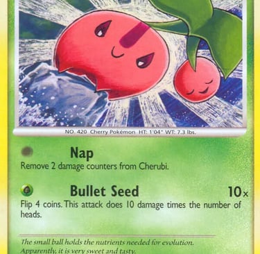The choice for what Cherubi to run doesn’t really matter much since they all have 50 HP and don’t do anything as useful as Majestic Dawn Eevee we looked above. But for technicality’s sake the Stormfront print should be the best choice for the potential lucky damage flipping 4 coins. The Supreme Victors one would have been great if it could attach energies to other pokemon beside itself but that’s not the case. An argument could be made that the original one from the first set might be the best choice inflicting auto sleep for 1 but I’d rather go for damage.