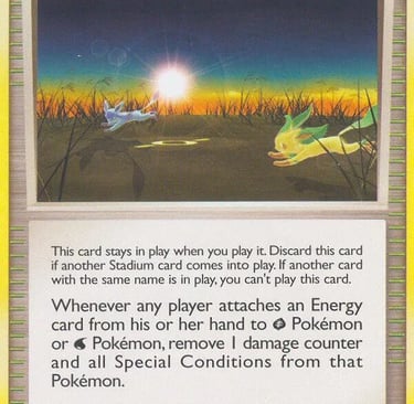 While being featured in the artwork isn’t always an indication of obvious synergy, it really is almost a given that this stadium was made to work with Leafeon and Glaceon as the theme pokemon form Majestic Dawn. Dawn Stadium is nice because a lot of decks probably won’t be using it so it makes for a good counter stadium choice. Of course, we wouldn’t be running it for just this bland reason its effect actually adds up to our healing with other effects. While it’s true that water decks will be able to exploit it too Gyarados and Kingdra don’t particularly attach energies that much anyway so they probably won’t make as much use of it compared to us. Healing special conditions may also come up to which is nice.
