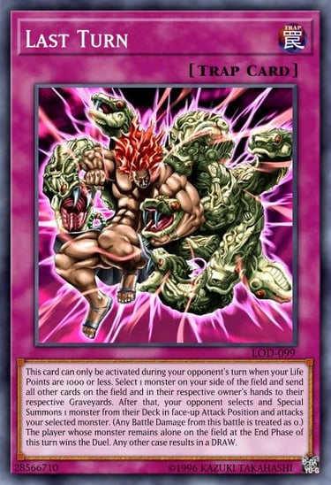 You know, after stomaching what the other two above cards are capable of and how cursed their presence was in the format, Last Turn seems almost mild by comparison but nevertheless this is another “one card win condition” that literally guarantees that term word for word. I am only being light-hearted when jokingly suggesting this card is “mild” but truly unlike the other two at least this card provides a swift end and requires a LP condition of 1000 or less to activate so with a little luck your opponent could play around it. As its name suggests the resolve of this card is the final moment of the duel and whether you win, lose or draw there’s a guaranteed outcome. This card has to resolve during your opponent’s turn too, but once it does you choose a monster on your field and then send all other cards from the field and in both players’ hand in the graveyard.