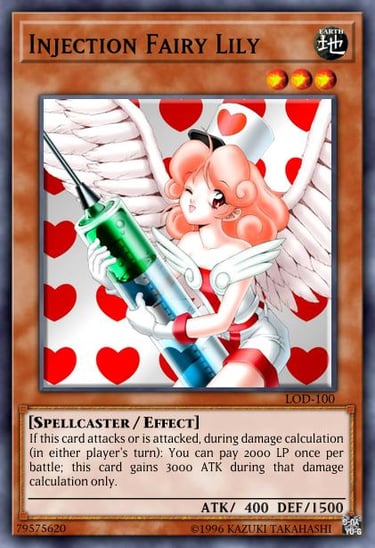 A yugioh icon almost as popular as Dark Magician Girl, Injection Fairy Lily had come out even before Magician Girl. If you have or are willing to spend a big chunk of LP this card would be another great way to deal with the biggest monsters, even able to beat Blue Eyes White Dragon in battle. The best part is you can use her effect when your opponent was attacking too.