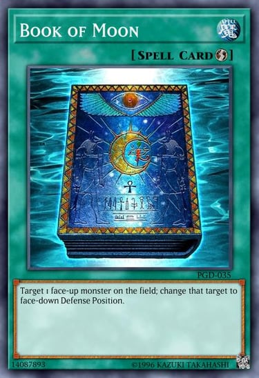 With so many extreme spell and trap cards already in the format, in addition to cards like Ring of Destruction from this same set, changing a monster to face down defence position might seem underwhelming. Speaking of Ring of Destruction ironically Book of Moon is a card that can counter it with its effect and so we get to the root of why Book of Moon is a great card. The combination of it being a quick play spell that can force a monster into face down defence position can be handy in so many different scenarios during a duel. From turning off an annoying effect on an effect monster like Jinzo, dealing with a high attack monster that has low defence, countering cards like Snatch Steal, helping you reuse a flip effect again, the list is endless. Rest assured this card will rarely be of no use to you in a game.