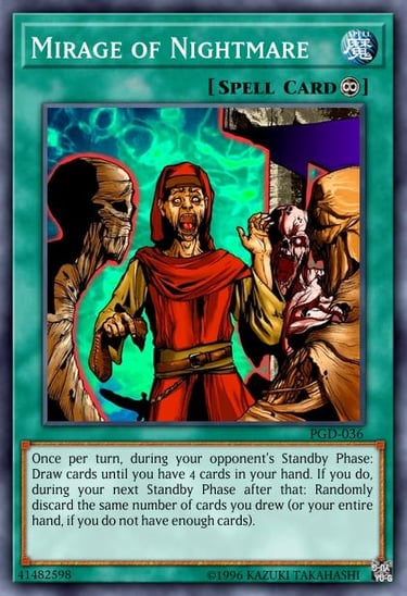 Introducing another extreme draw card, Mirage of Nightmare needs a little be of aid to get the most out of but if you perform this simple combo this draw card can put even Pot of Greed to shame. After you play this spell card it won’t do anything until your opponent’s standby phase. On that moment you must draw cards until you have 4 in hand. So, the lower your hand size the more free cards you can draw. The condition for such a strong drawing effect is that on your standby phase you must randomly discard the same amount of cards you drew by this effect. As a very young child I remember reading this card and thinking of how useless it was. “What is the point of this effect?” I thought. But in reality it’s a simple combo. All you have to do is make sure you remove this card yourself from the field with Mystical Space Typhoon or some other method and you get to dodge the drawback completely. Even in the animated series and manga Judai Yuki made this combo countless times; it was an easy way for the writer to replenish his hand in duels.