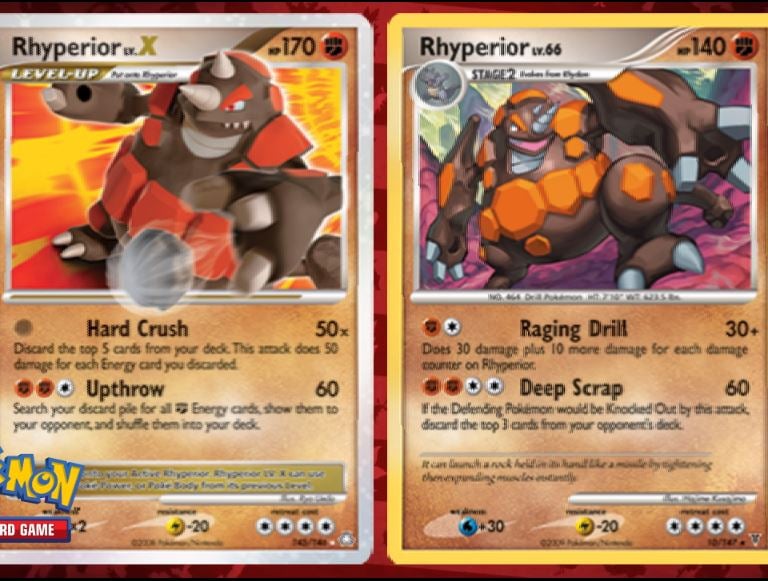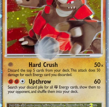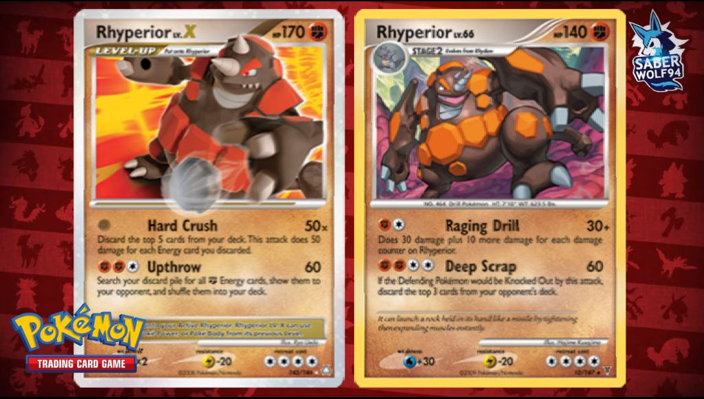 Rhyperior Lv. X stands out as the one and only pokemon with 170 HP in the Diamond and Pearl era. This is the highest out of every other Lv. X card and outside of two Wailord cards in the era no other pokemon had more HP. The other appeal is in its type, as a fighting type pokemon it poses a big threat to Luxray GL Lv. X, possibly the most dangerous pokemon in the era. All Rhyperior cards also have a resistance to lightning giving even more headaches to Luxray as it won’t even be able to hurt us much. The bad news is that Rhyperior has costly attacks that don’t even do the excessive damage you might expect for the energy costs you pay. Even so, the following list gives you a good chance to remedy that and also reap some additional effects not common on other pokemon: