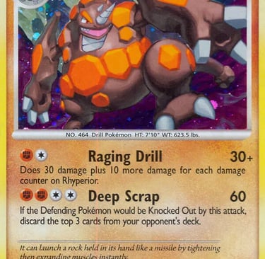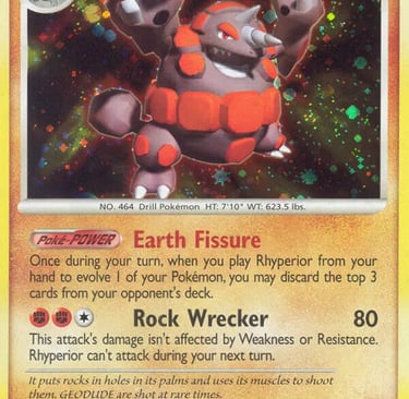 The original Diamond Pearl Rhyperior is beautiful, as with all rare holos in this set, but I promise I have valid reasons for running it besides that. When you evolve into this card you can discard the top 3 cards of your opponent’s deck with Earth Fissure. If you get to recover this card again late game and evolve a second time that’s 3 more cards. By no means do we aim to deck out our opponent as our main tactic but you can clearly see how these discards can add up when paired up with the other Rhyperior too. You never know what your opponent may lose, so it’s just a handy bonus. Rock Wrecker doing 80 for 3 isn’t as mighty as I thought when I was a kid but it’s a solid chunk that can finish off softened pokemon. It’s definitely better than 60 for 3. The problem with this attack is that it doesn’t hit for weakness and even worse than that is Rhyperior won’t be able to attack at all next turn.