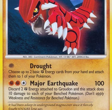 This card is amazing for so many reasons. Quite honestly if I owned a full play set I would have experimented running all 4 as the corner stone of this deck and many others. Instead we’ll be prioritizing some different pokemon but even one copy of this Groudon has a lot to offer. You’ll probably first set your eyes on the number 100 on it. Beautiful 100 HP and it’s also packing an 100 for 3 attack. The HP is obviously excellent for a basic pokemon and it makes for one of your best starters. The weakness to grass is also better than a weakness to water for the most part thanks to Gyarados, Kingdra and Palkia being some of the toughest decks around. Even though it won’t hit them for weakness or anything it’s nice that they can’t hit Groudon for weakness either seeing as our primary pokemon Rhyperior is weak to water. Lightning resistance will also make this card last forever against Luxray. Drought is a costless attack that can help power up our Rhyperior and any pokemon really with fighting energies quickly.
