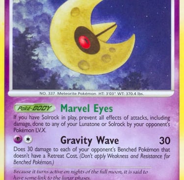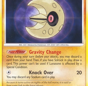 Lunatone is a big liability against Stormfront Gengar because it has a poke-power while having 60 HP. As much as that sucks the combo between this card and Solrock is our main form of draw power outside of supporters. If you have Solrock in play Lunatone allows you to discard a card from your hand and draw 1 from your deck. This little mini draw may not seem that impressive but because Lunatone is a basic pokemon if we get two or three of these out with Solrock the draw will start to add up. It’s not just the draw though; this effect obviously pairs with Sol Charge, allowing us to ditch fighting energies for Solrock to grab back when it attacks. 20 for 1 is also better than what other support pokemon can do even if it won’t be as good as Solrock grabbing energies.