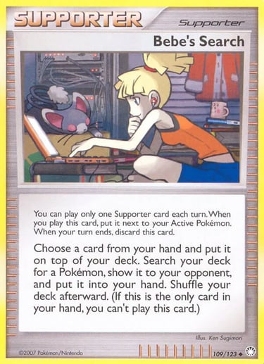 I’ve never been the biggest fan of supporter cards that have you pay a cost only to get 1 card but if we’re not over relying on her 1 Bebe’s Search in the deck should be fine. She can also turn into a draw supporter if you use her to get Uxie but you’d rather use her to get evolution pokemon. A lot of decks in the era would play 3-4 of her only because you’d grab Claydol and then you can draw additional cards that way. So, even though you’ve spend your supporter and didn’t gain any card advantage it would balance out with draw from Claydol. From there, you can use Claydol to draw more cards every turn. Since I don’t have Claydol in this deck though, we’d rather have supporters that actually draw us multiple cards.