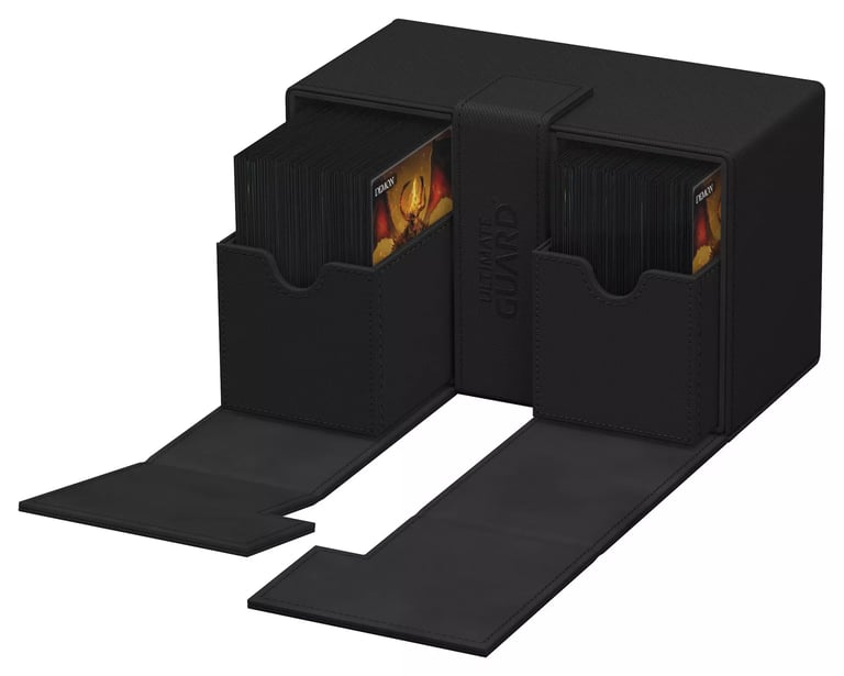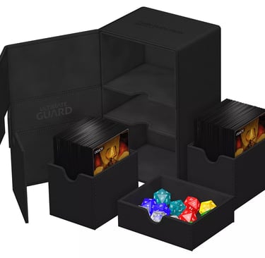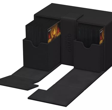 The Twin Flip'N'Tray offers double the size of the classic Flip'N'Tray, making it a great upgrade if you want a deck box to hold more cards. With its spacious interior, players can store two decks of cards without worrying about damage or wear. The additional compartment is perfect for accessories – think dice, tokens, or even markers – ensuring everything you need is easily accessible in one place. Gamers often face the struggle of keeping their materials organized during play, and this deck box provides a streamlined solution. Ultimate Guard also offers this deck box in multiple storage capacities; from a 160+, 200+ and a 266+ card option so you can easily pick the version that's most appropriate for your needs.