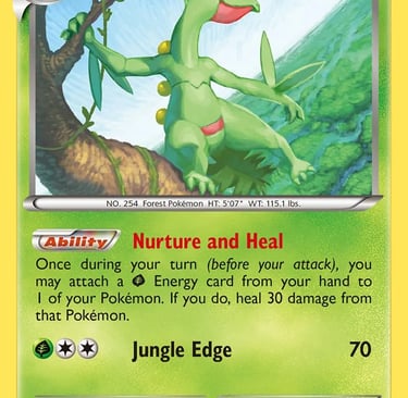 Instead of making 1 really good Sceptile card Primal Clash split a few good aspects between 2 cards, and the result was none of them ended up good enough to compete on the highest levels. The only semi-good thing on this Sceptile card is the Nurture and Heal ability giving you some grass energy acceleration from the hand but not quite the Blastoise Rain Dance style. You see you only get 1 extra attachment as opposed to however many you want. Additionally you will get a 30 damage heal on the pokemon you attached which is nice but not a good trade-off in terms of speed. Given how similar energy acceleration abilities work you’d rather be able attaching as many energies as you want and for this reason it limited the type of pokemon you could reliably power up.