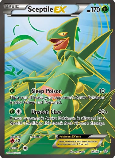 To talk about Sceptile EX from Ancient Origins is ironic, as it’s more of an attacker than its mega form from the same set, an uncommon occasion as it usually went the other way around most of the time. It might be a bit confusing if you’re unfamiliar with this card, but it is actually one of the few Sceptile cards that saw some attempts at serious play. As a basic EX pokemon from the gen 6 era all you gotta do is just play it down and it’s nearly ready; there’s a reason EX pokemon were so dominant in gen 5 and gen 6 and it’s true, this Sceptile card is much faster to use than all the other ones before it. Its stats were also pretty common for an EX from that era so nothing else to add on its stats. It has 2 simple and cheap attacks that also combo with each other surprise, surprise. Sleep Poison isn’t consistent as a coin flip attack, but if you do get the heads getting auto sleep and poison is strong for 1 energy and either way you’re always doing 10 damage.