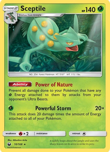 Just like Emerald Sceptile Celestial Storm Sceptile has an ability that can be extremely useful or irrelevant, however in this case if it comes up then it’s pretty much a guaranteed auto win. Power of Nature will make all your pokemon immune to damage from Ultra Beasts as long as they have any grass energy attached. Ultra Beast cards and decks were popular in the Sun and Moon era because they were strong so having such a widespread barrier against them automatically gives this card merit. Even so, Ultra Beast decks weren’t the ones being played so as I’ve said your luck with this ability will be pretty hit or miss. Good news is this card isn’t only an Ultra Beast wall, its powerful Storm attack can be build up to be dangerous if allowed, but having said that it won’t be so easy. It does 20 damage times all of your energies on the field and you’re gonna need 6-10 around to be doing any serious damage.