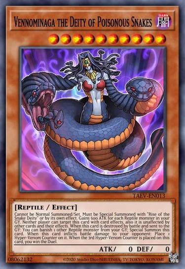Key cards for TAEV include: Necro Gardna, the Venom and reptile cards, Elemental Hero Neos Alius, Crystal Seer, Zombie Master, Fifth Hope, Double Summon, Summoner’s Art, Common Charity, the Gemini cards.