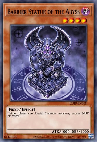 Key cards certainly include: Vanity’s Fiend, the Elemental Barrier Statues, Vanity’s Ruler, the Cyberdark cards, Instant Fusion, Chain Strike, Degenerate Circuit, Justi-Break, Accumulated Fortune and Black Horn of Heaven.
